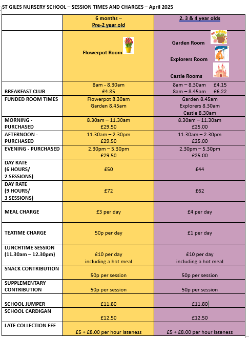 At St Giles Nursery School we offer a variety of snacks throughout the day as well as various cooking opportunities. The children are offered a range of activities throughout the week, such as Forest School and Dance lessons. We ask our parents to support us by paying towards these snacks and activities to enable us to provide the high quality of service we pride ourselves on.